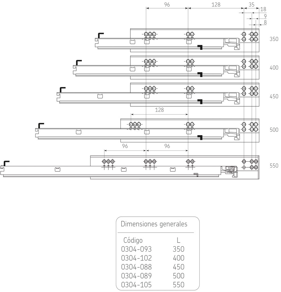 Corredera bajo montaje fijación con soporte Cerrajes «Okulta» L=350mm Zincada Extensión total Cierre suave