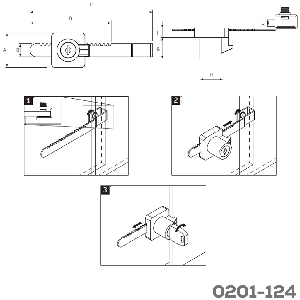 Cerradura para vitrina con puertas de cristal 4-7mm CL L=122mm