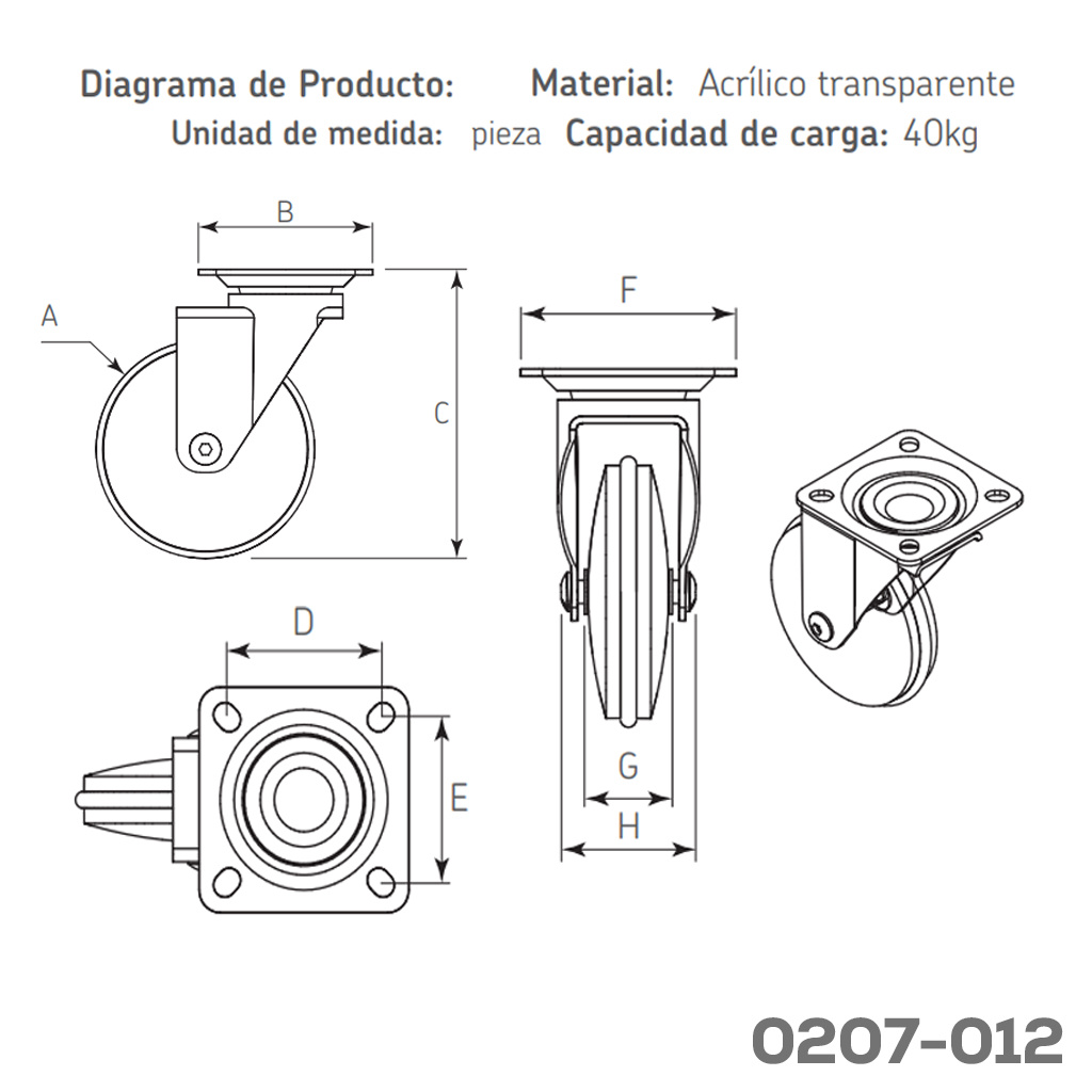 Rodaja para gabinete con freno placa 60x60mm Cerrajes acrílico Ø=75mm transparente 40Kg