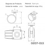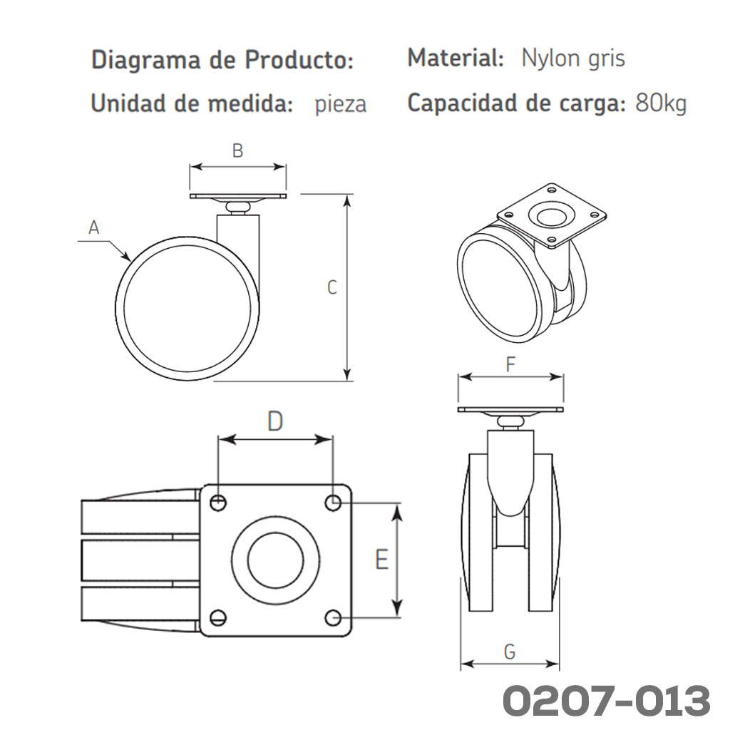 Rodaja para gabinete placa 50x50mm Cerrajes nylon Ø=75mm gris 80Kg